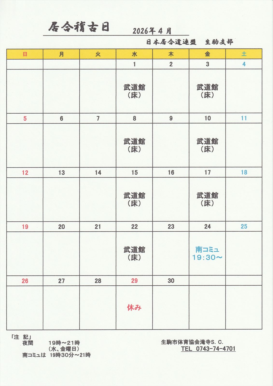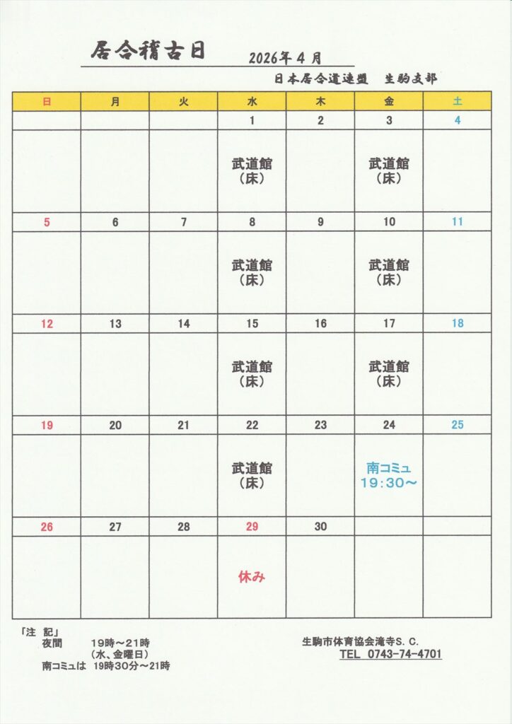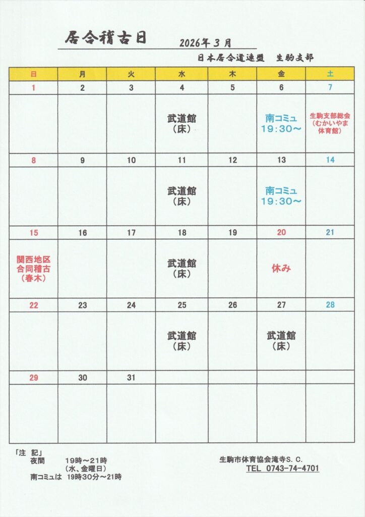 2026年3月のスケジュール。先週あたりから、武道館の室温は11度くらいになり、随分と動きやすくなりました。見学や体験は自由にできますので、ぜひとも、来てください。